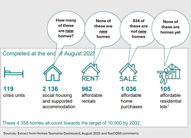 As at 31 August 2025, Homes Tasmania has delivered a mix of 4,358 homes, residential land lots and crisis units. However, the actual number of homes and crisis units they have delivered is 4,253; and the number of new homes and crisis units delivered is, at most, 2,657.