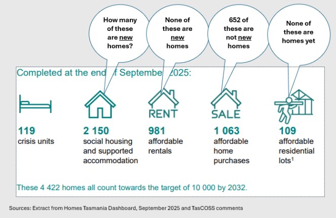 This infographic (above) shows that Homes Tasmania has made progress towards achieving its 10,000 target, but not all of what they have delivered is actually a home. As well, many of the deliverables are re-purposed homes rather than new homes — and therefore do not contribute to overall housing supply.